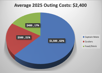 Captain and Mate charges range between $1000-$2000 per outing depending on our volume of guests who are able to make it.